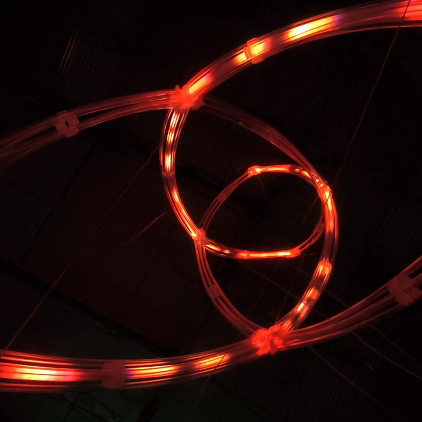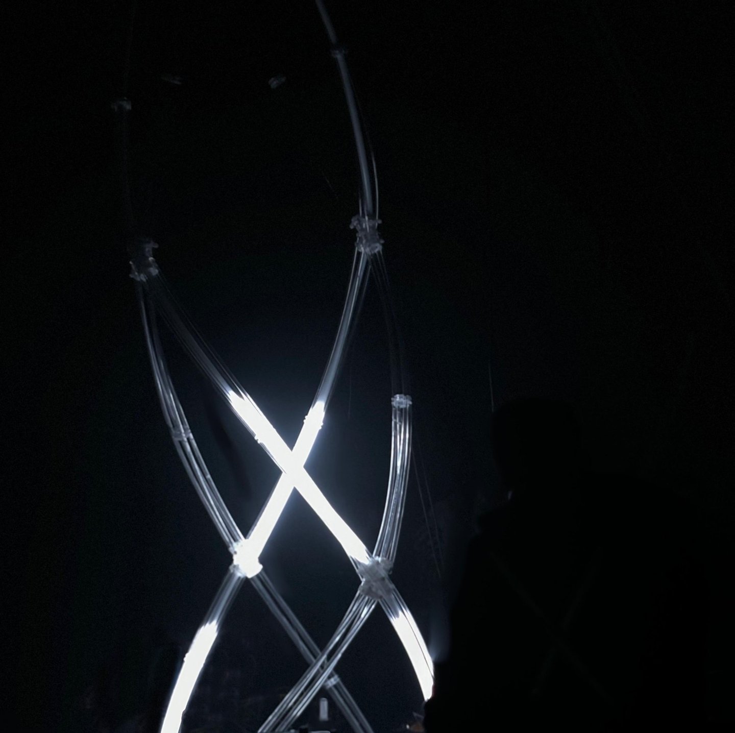 Developed as part of our ongoing research into nodal and tensile systems, the prototype investigates how luminous linear elements can intersect, bend, and generate volumetric presence through controlled tension.